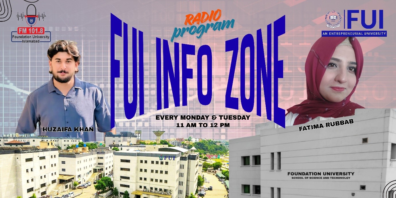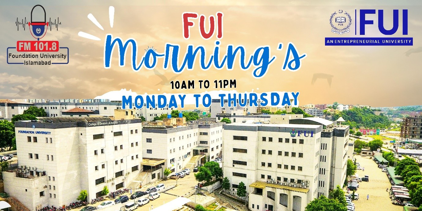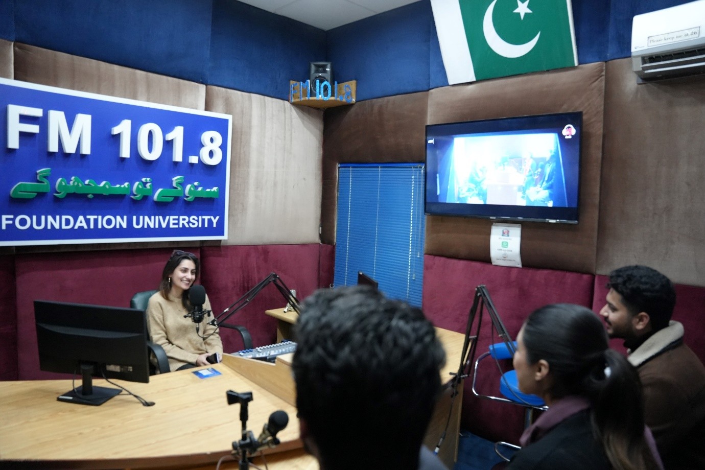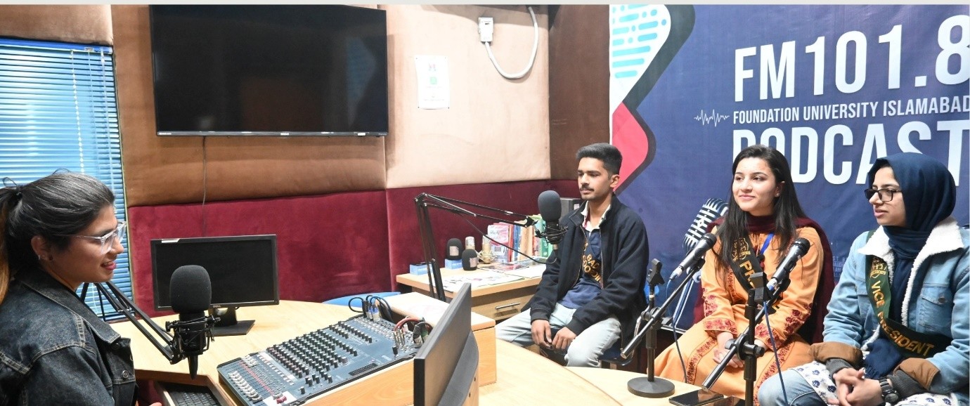 FM 101.8 MHz, established in 2017 at Foundation University Islamabad, serves as a dynamic learning lab for emerging media talent. With 12 hours of transmission from 8:30 AM to 8:30 PM, Monday through Friday, the station informs, educates, and entertains through news, discussions, and vibrant student-led shows. From Promoting Pakistan to A Pleasant Morning Show, and from FUI-ITES creativity to Health Studio inspiration, the station offers diverse content. It delivers sports excitement, classroom energy, faculty stories, Folk Rung colours, global beats, new hits, and evergreen classics. From powerful radio-casts to Incredible Pakistan, FM 101.8 keeps listeners engaged all day. A skilled team and state-of-the-art technology transform young voices into listener Favorite sounds. Built as a modern campus radio, it features advanced studios and professional production facilities. Students receive hands-on training in production, scriptwriting, anchoring, editing, and creative development. Through radio shows and regular podcasts, learners manage everything from concept to distribution, gaining an immersive broadcasting experience.